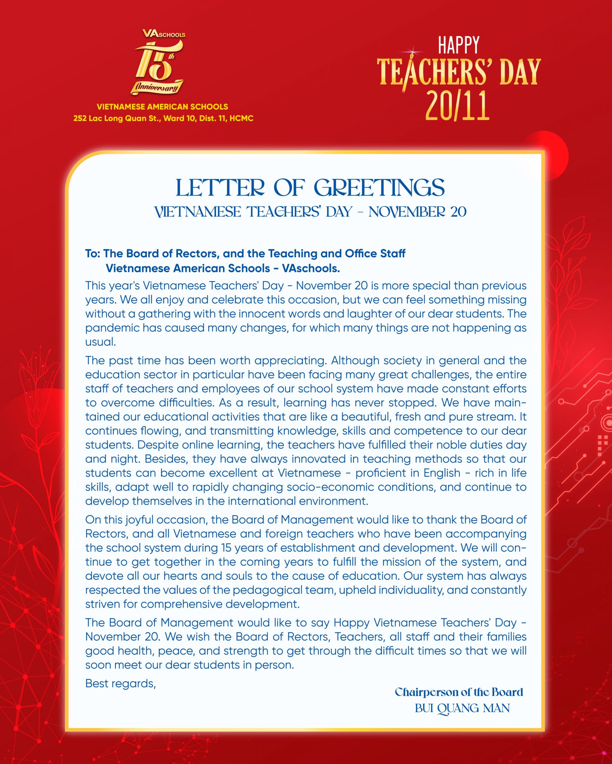 LETTER OF GREETINGS VIETNAMESE TEACHERS’ DAY – NOVEMBER 20