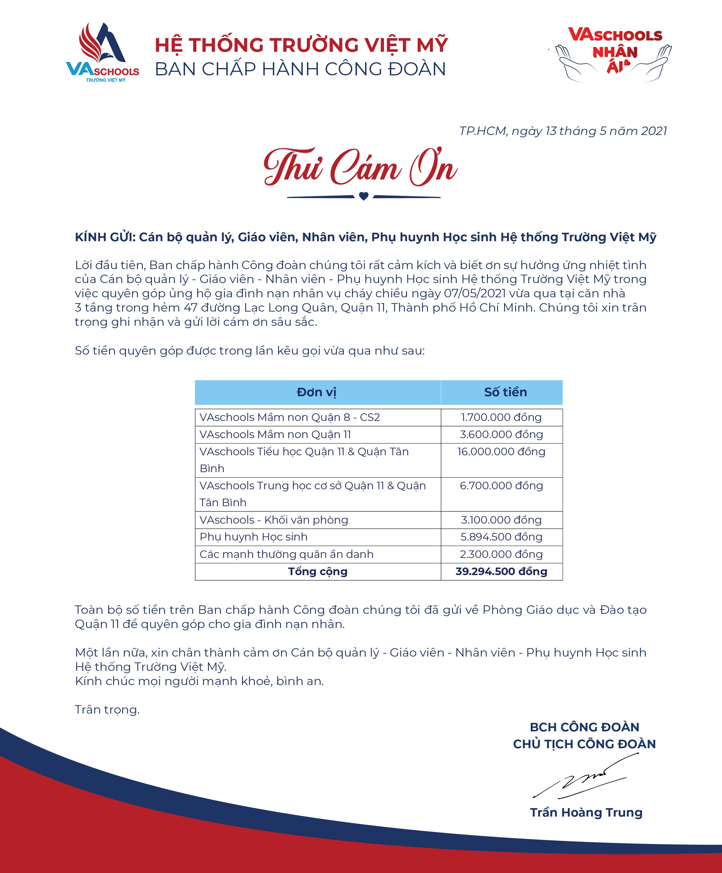 THƯ CẢM ƠN