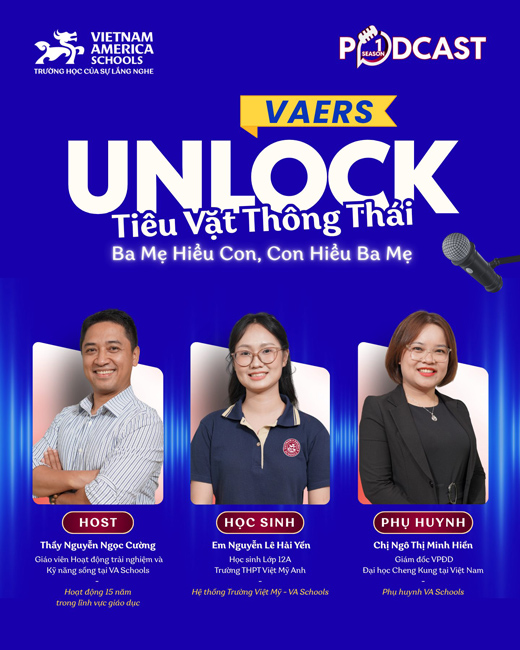 VAERS UNLOCK – chuỗi podcast đầu tiên của Hệ thống Trường Việt Mỹ – VA Schools, mở màn với chủ đề Unlock Finance, mang đến góc nhìn chân thật và gần gũi về câu chuyện tài chính cá nhân từ hai thế hệ: Học sinh và Phụ huynh.